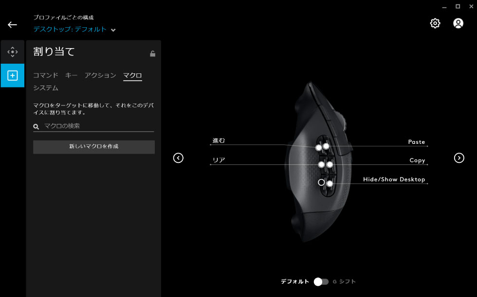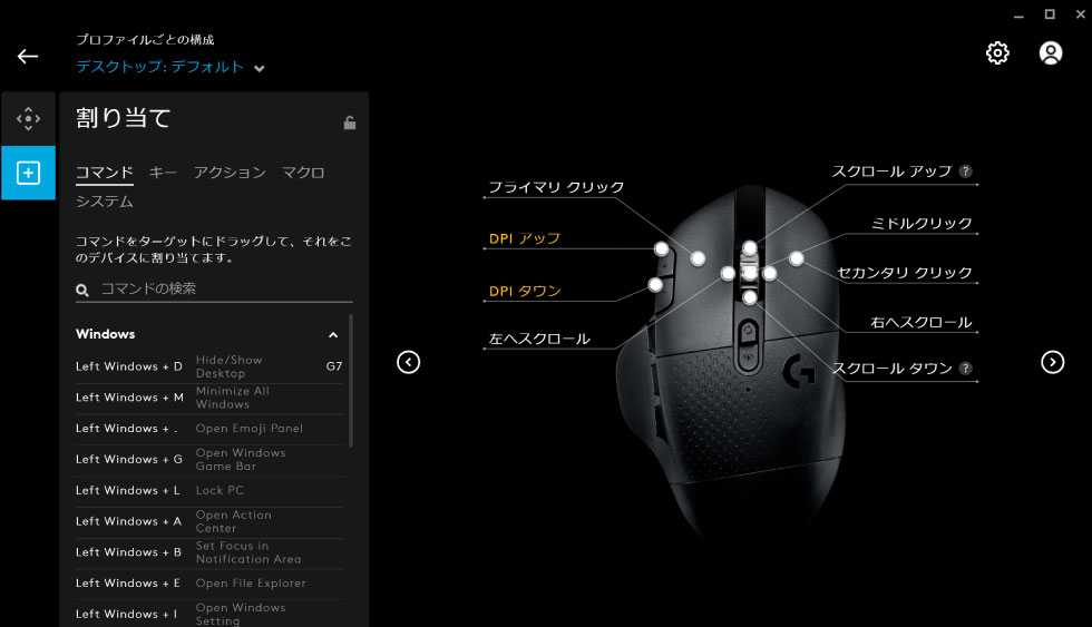 ロジクールデバイスには「G HUB」という専用のPCアプリケーションが用意されているので、それを使ってサイドボタンなどへの割当を行います。