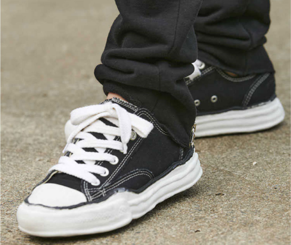 ConverseやVansの定番モデルをベースにディテールを踏襲し、オリジナルソールを配し、そのソールの存在感に揃えるように、太めのシューレースがセットされ、今のストリートの匂いが存分に反映された一足となっています。