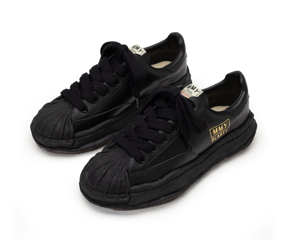 “ブレイキー”モデルのレザーローカットスニーカー。キャンバスバージョンとレザーバージョンがあり、MMYとともにモデル名がプリントされています。